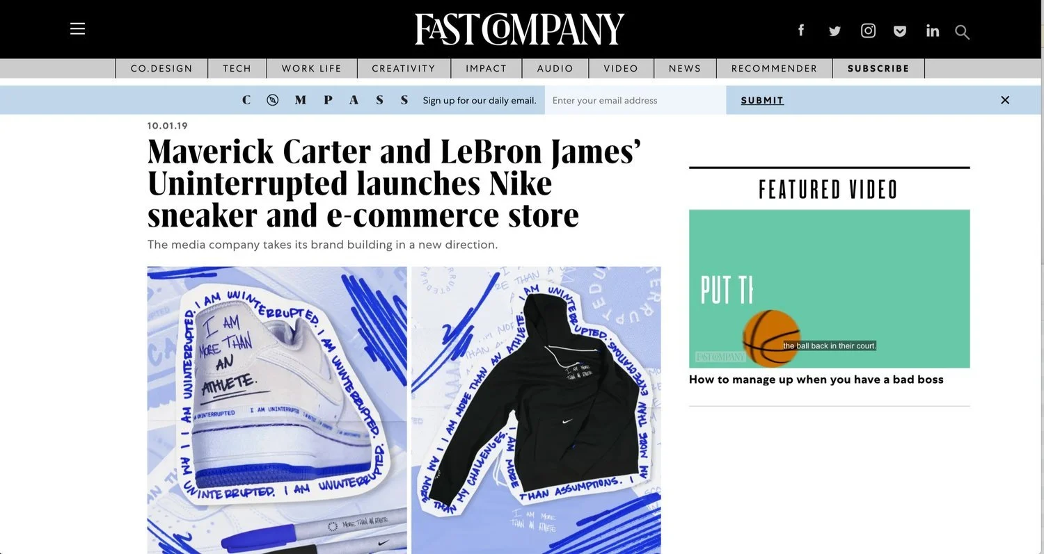 Co-created the tagline for Uninterrupted, which became a cornerstone for the brand. This campaign and brand work led to the launch of the Uninterrupted Shop, its Nike shoe and collection collaborations, a world tour with LeBron James, and an episodic series with ESPN, among many other partnerships.